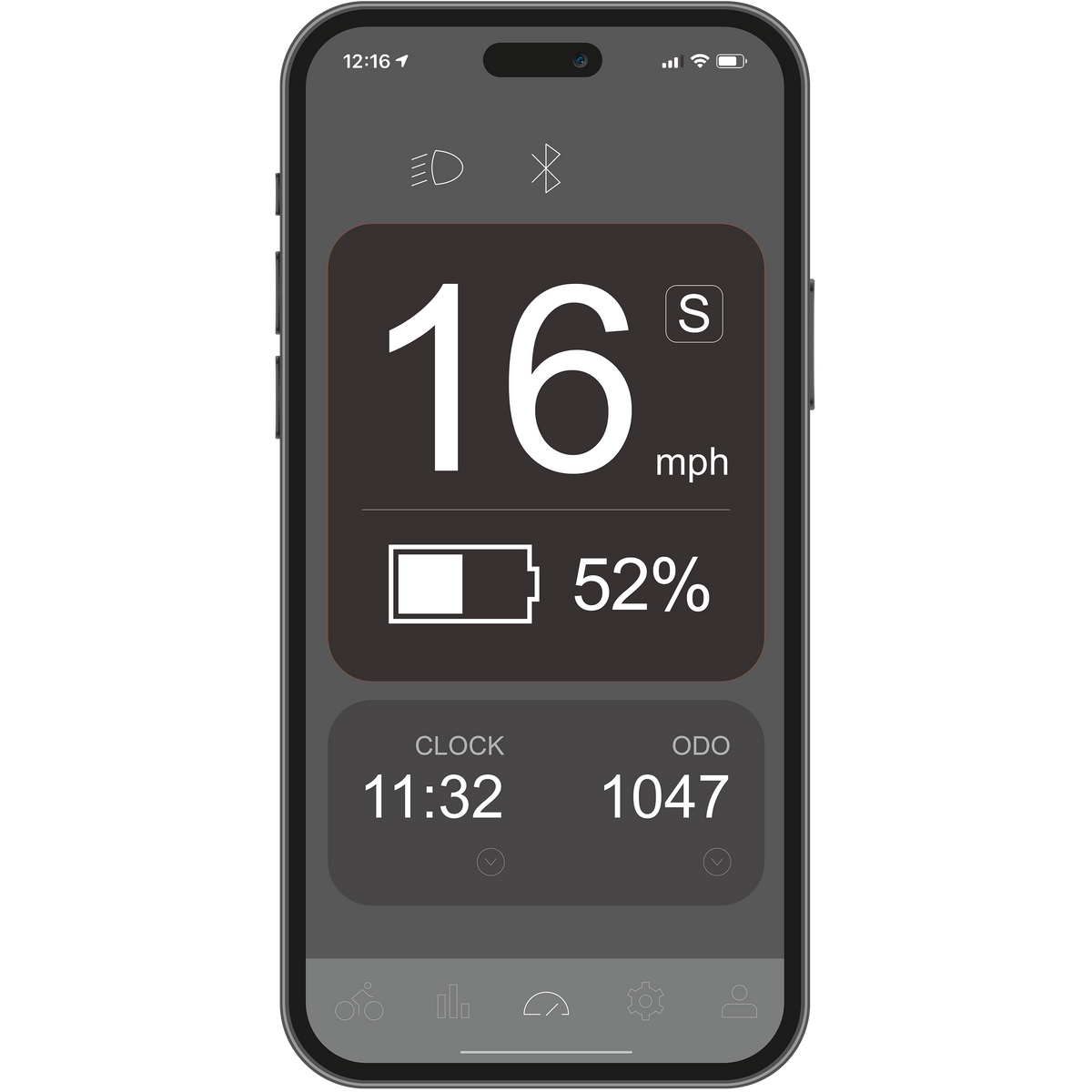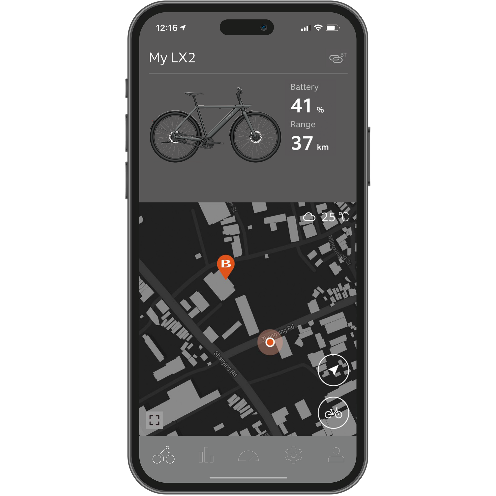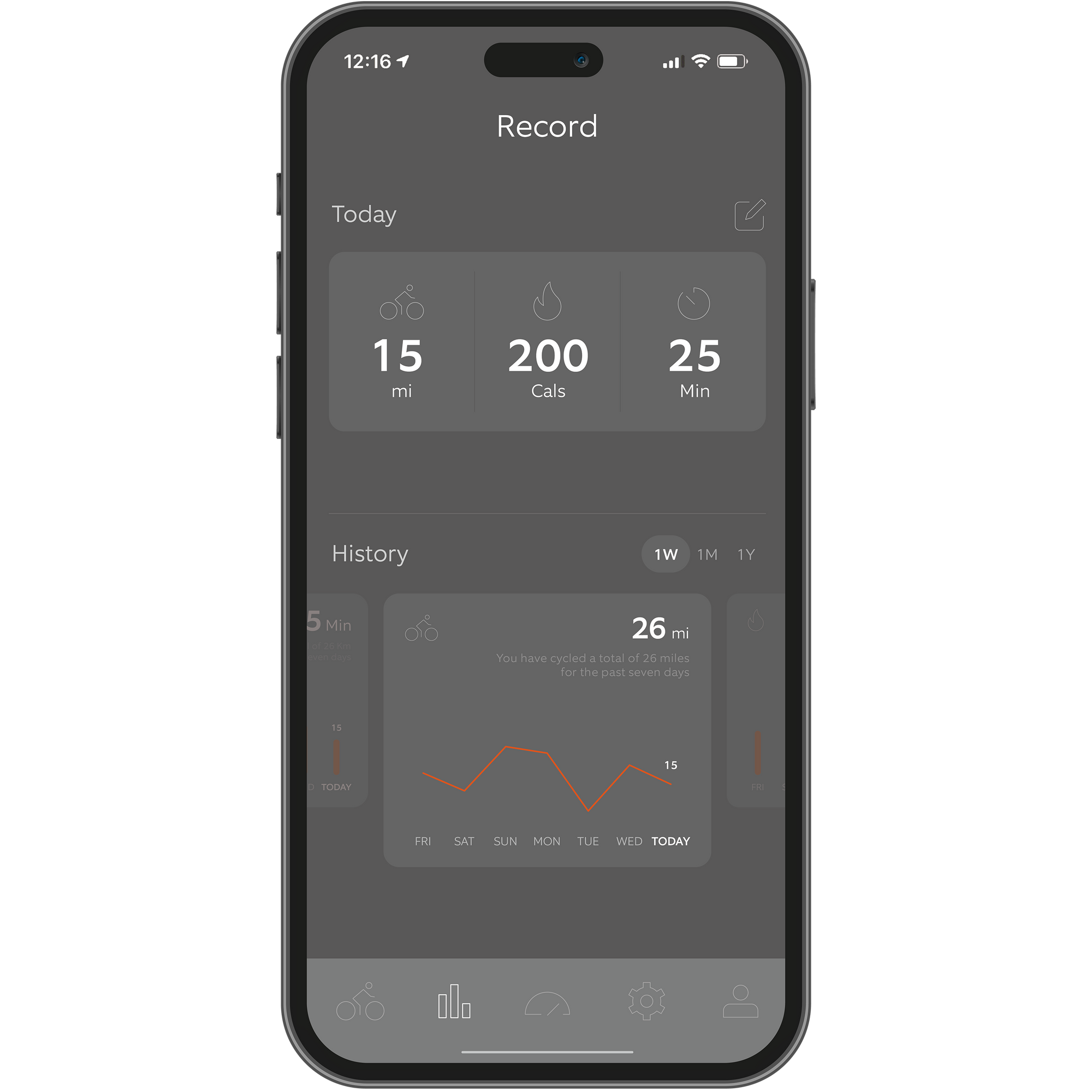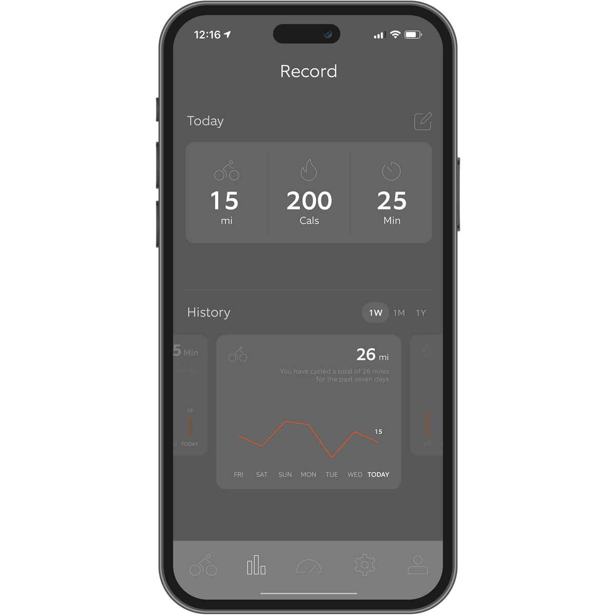 Dank der integrierten Sensoren im Fahrrad können Sie alle Ihre Aktivitäten detailliert verfolgen: Fahrzeit, Geschwindigkeit, Höhenlage, erbrachte Leistung, verbrannte Kalorien und mehr.